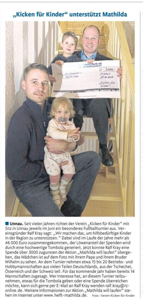 Artikel der Rhein-Zeitung zur Unterstützung des Spendenaufrufs “Mathilda will laufen”. Weitere Infos zum Projekt findest du unter www.help-mathilda.com.